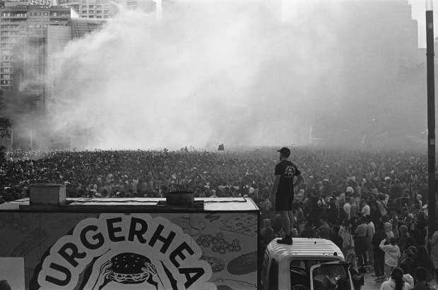 A chef stands on his burger truck and watches over an infernal Sydney crowd as Craig Goodwin secures a goal against Argentina with 13 minutes remaining. Sydney, 4th December, 7am. Ilford hp5.