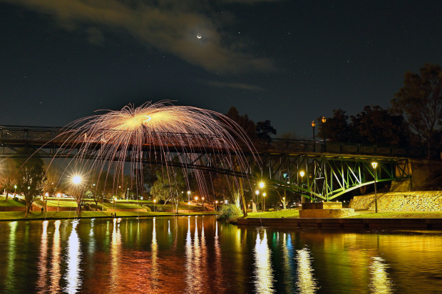 This photo was taken during the Nikon x Teds Flames In Focus: A Steel Wool Spectacle. Hosted by Nikon's Toban Darley in North Adelaide. This image is a mesmerizing spectacle of steel wool spinning, creating a shower of glowing sparks in creative patterns. A magical combination of colour, motion and light.