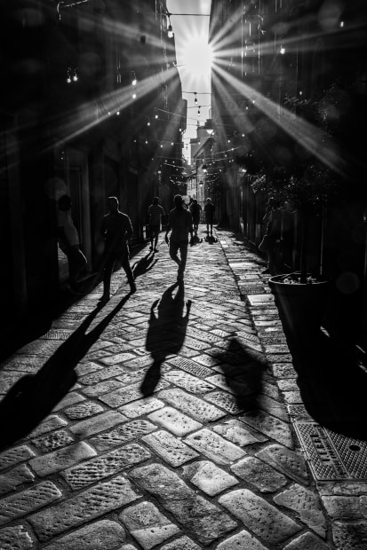 Narrow street in Genoa with sun setting to highlight extreme shadows of the locals.