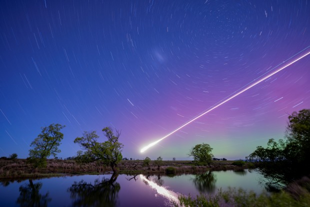 Amazing colour's of the Aurora over the South Esk River at Evandale Tasmania. Startrails and an aircraft made for a great image