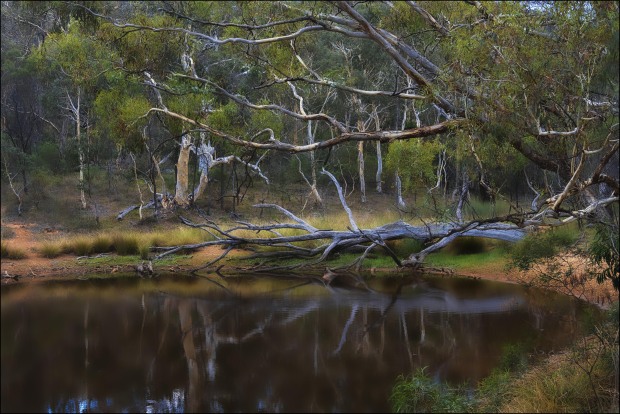 On Ngunnawal Country, at the foot of Mount Majura’s slopes, a still dam mirrors the tangled beauty of the Australian bush. Fallen eucalypt limbs stretch across the water’s surface, their silvered bark telling stories of age and resilience. Native grasses fringe the bank, softening the earthy tones, while the surrounding woodland stands in quiet witness. Captured during a Cultural Interpretation Tour led by Ngunnawal Traditional Custodian Tyronne Bell, the image embodies the deep ties between Country, language, and culture — where every branch, stone, and reflection holds meaning passed through generations.