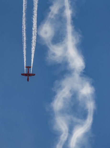 The acrobatic stunt planes performing at the boat races in Yarrawonga. This image captures the smoke trails of the plane on the way up and on the way down from a loop. The skills of the pilot have been recorded by the smoke.