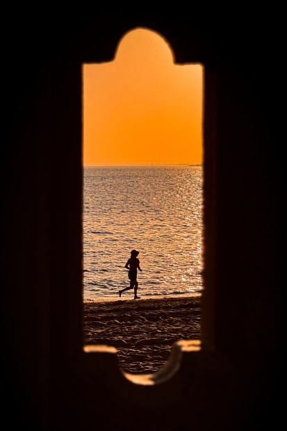 Captured through the frame of a pedestrian bridge, this photograph reveals a fleeting moment of a boy running along the shoreline at dusk. The sea and fading orange sky set the backdrop, embodying the transient beauty of light, motion, and time. Shot on an iPhone, without equipment or preparation—just a passing moment, before it fades.