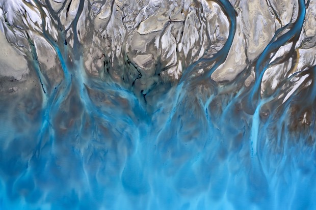 Captured from the sky, a braided river meets a glacial lake on the beautiful South Island of New Zealand.