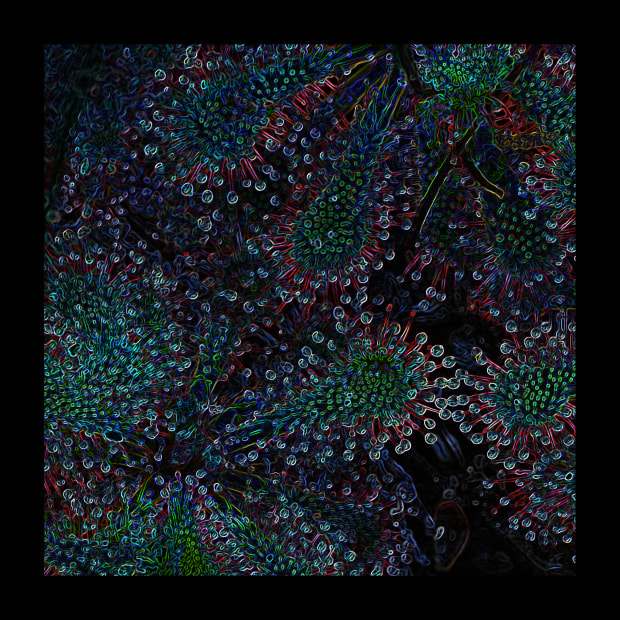Butterfly Vision emerges from the meditation on sight beyond human limits—a field where birds and butterflies perceive dimensions of light hidden from us. This expanded vision opens ultraviolet, polarized light, and subtle gradations of color invisible to us. For these butterflies, perception is not confined to form but becomes a gateway into relationship, recognition, and resonance. This image contemplates that same possibility for us: that higher states of being may unfold when we learn to see beyond the visible, into the subtle harmonies woven through all of life. Original macro photo of a Sundew/Drosera spatulata.