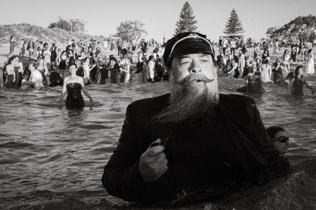 A man dressed as sea captain navigates throught the waves at City Beach, Western Australia, pipe in hand.