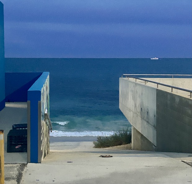 "Descent into the Blue" captures the essence of the calm before the storm. The green-blue colours of the ocean contrasts with the sky scaffolding the visual tension with emotion, echoed in the right angle of the wall to the left. The concrete ramp and walls guide the viewer's gaze to the turmoil beneath the surface of the waterline, while the milkcrates and a boat suggest regardless of the weather; human activity will persevere. This serene yet charged atmosphere invites reflection on the transient nature of the present allure of peace and the tensions that change evokes, thus creating a rich, evocative experience that resonates visually and psychologically.