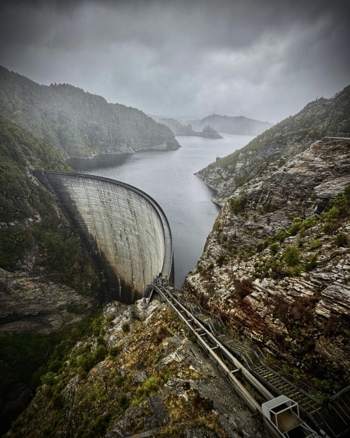 Tasmania's mighty Gordon Dam sits deep within the reaches of the Franklin-Gordon Wild Rivers National Park, you don't stumble on it by chance. On a freezing day we drove through spectacular scenery to reach it, with a plan to walk down the very steep stairs and across the dam wall. In the howling wind and biting rain though, it was far too scary. Taking this shot in the conditions was a challenge enough, but the view was worth it!