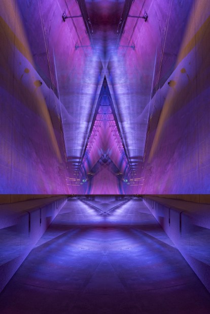 Martin Place, a Sydney underground train station tunnel, rotated and flipped to produce a surreal play of symmetry and light.