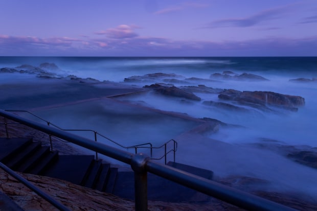 As a stormy day at Blue Pool, Bermagui softens into evening, a long exposure softens the onslaught of the sea upon the pools.