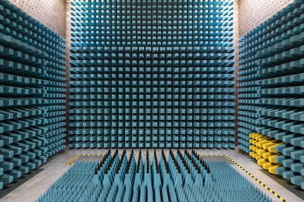 Part of a long term project capturing places of science and engineering, spaces that are unseen and unfamiliar to the majority. My intent is to reveal the accidental aesthetics that exists in these spaces built with form and function as a priority, exploring the idea of art intersecting with science and at its core playing on this notion of beauty being in the eye of the beholder. This particular image captures an Electromagnetic compatibility (EMC) chamber. A highly specialized room designed to test electronic devices and accurately measure their electromagnetic waves and emissions. The symmetrical baffles on the walls reflect and redirect waves to a single point for measurement.