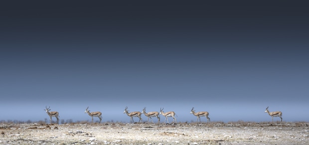 As I looked towards the distant ridge, a pronk of Springboks paraded across the white rubble landscape, offset by a clear blue sky. The uncluttered beauty of this shot grabbed my attention. The colours of the foreground complementing the Springbok, while allowing them to standout against the sky.