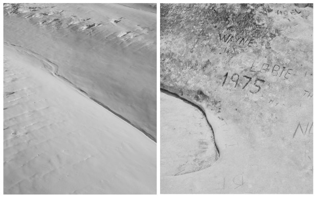 A recent walk in the Blue Mountains led me to a rock face covered in carved love declarations—messages etched into nature. It brought to mind an earlier project, The Tears of Hinehukatere, photographed in New Zealand’s South Island. The Māori story behind it speaks of love and loss, set against the backdrop of a glacier. I was struck by how the cracks in the ice echoed the carved marks in stone. That visual link, emotional and physical marks left on the land, led me to start pairing the two.
