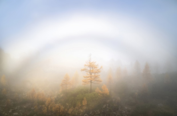 A spectacular autumnal fogbow on the hike to Slemenova Špica in the Julian Alps, Slovenia