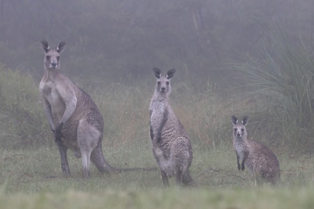 In a still misty morning, three kangaroos gather for a photo, standing alert their forms softened by fog.