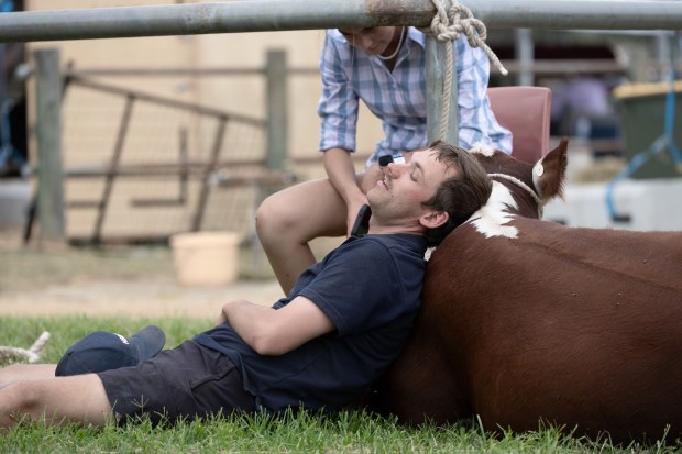 Captured at the Canberra Show, a farmer leans against his cow for a quiet moment of rest.