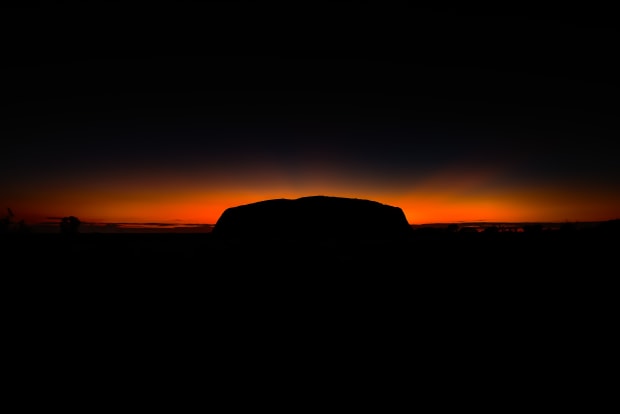 At sunrise, Uluṟu becomes a silhouette—stripped of detail, but not of power. The rock stands as a dark shape against a horizon ignited.