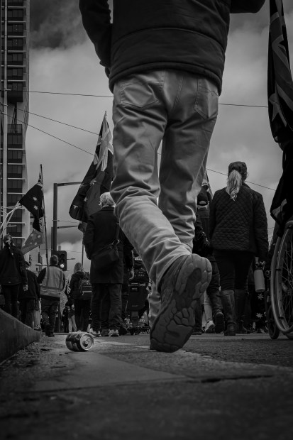A crowd marches forward waving Australian flags, their cause wrapped in calls for a “better” Australia. Yet the foreground tells a different story: a discarded alcohol can sits ignored on the pavement. Hundreds pass it by without thought, stepping over the waste as though it isn’t their problem. The image captures the hypocrisy with sharp clarity—people chanting for national pride while refusing the simplest act of civic responsibility. Even more striking is the suggestion of alcohol at such an event, as though nationalism requires intoxication to take root. The frame freezes this contradiction—flag-waving patriotism above, careless littering below—a powerful reminder that a nation’s character is revealed not in its slogans, but in its smallest, everyday choices.