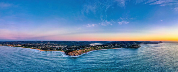 An aerial panorama in the early morning of the Northern end of the Northern Beaches of Sydney. Looking from Mona Vale up to Palm Beach.