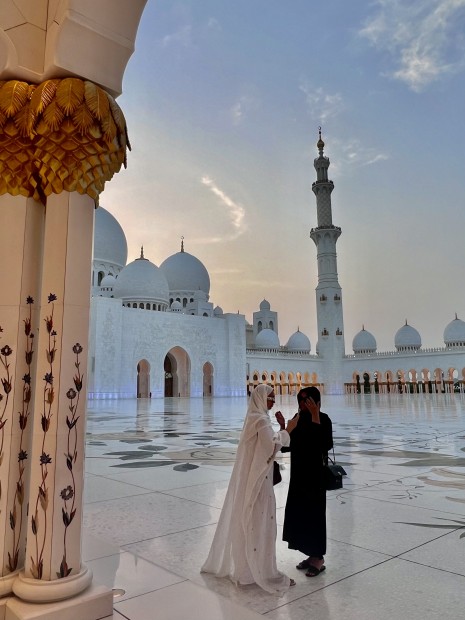 Two young Muslim women catch up for a chat in the spectacular grounds of the Grand Mosque in Abu Dhabi.