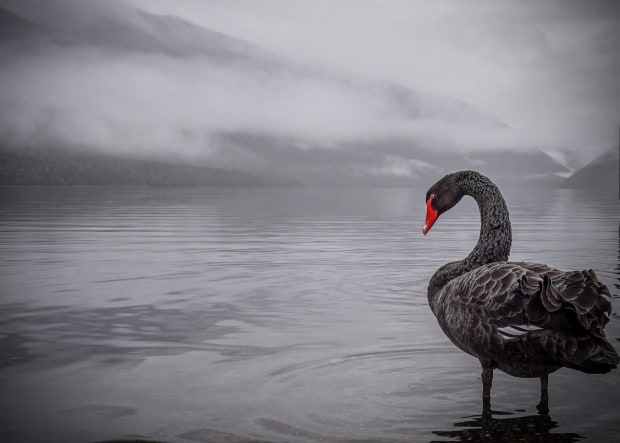 A lone black swan stands in the shallows of a mist-covered lake, its striking form mirrored against the still water. The scene captures the delicate balance between wildlife and environment, where atmosphere and presence merge into a moment of quiet harmony.
