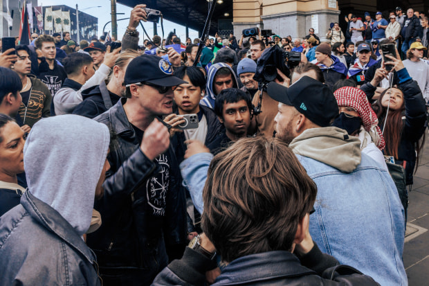 Snapped at an anti-immigration protest in Melbourne, this shot captures a tense face-off between two men mid-argument. With a crowd watching — some filming, others just caught in the moment — it shows how public protests can quickly turn personal, where opinions clash loud and raw in the middle of the street.