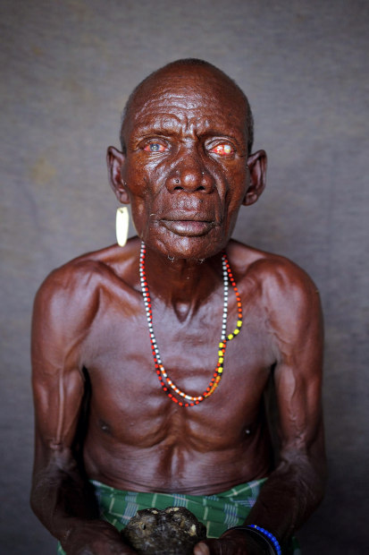 He's the chief of his tribe on the shores of Lake Turkana, Northern Kenya. Legend has it he fought and killed a hippopotamus with his bare hands. He wears part of a bone from that hippo as an earring and reminder of that event. He was a gentle, kind and welcoming man. I photographed him in the doorway of a simple home in the village.