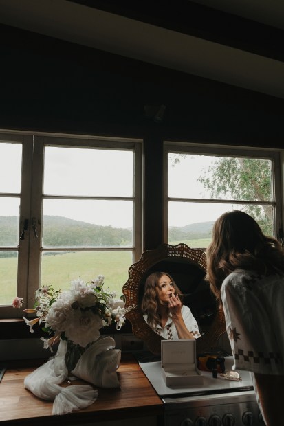 The bride taking a quiet moment to check her makeup and touch up her lipstick before putting on her wedding gown.