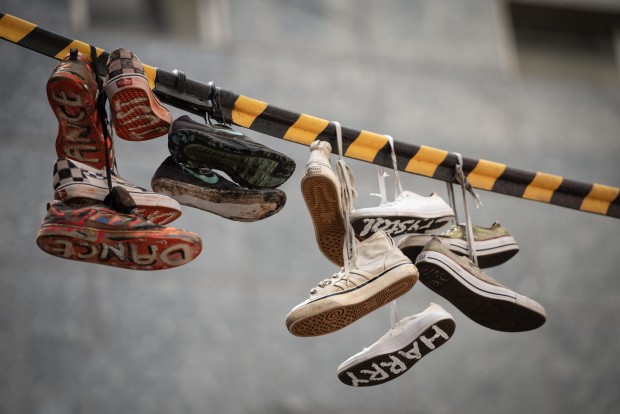 Suspended in mid-air, the shoes sway and twirl gracefully as if dancing to an invisible rhythm.