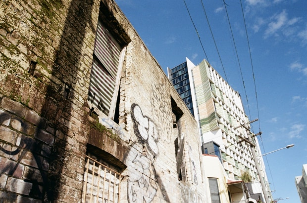 An abandoned terrace, covered in graffiti and moss, stands against the rise of new apartments behind it. The photograph reveals the layered textures of Redfern, where remnants of the past remain visible even as the suburb changes, showing the tension between history, neglect, and renewal.