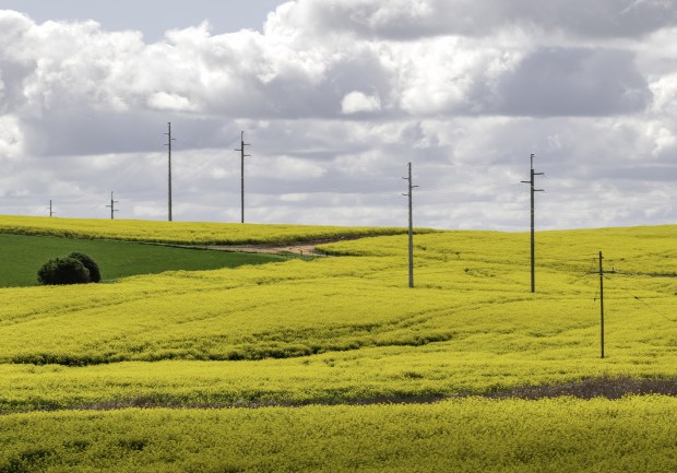 A sea of green and gold sways beneath a restless sky. Through their softness, tall electricity poles rise.