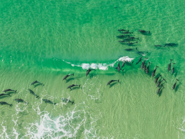 An entire Pod of Dolphins surfing on one sand bank