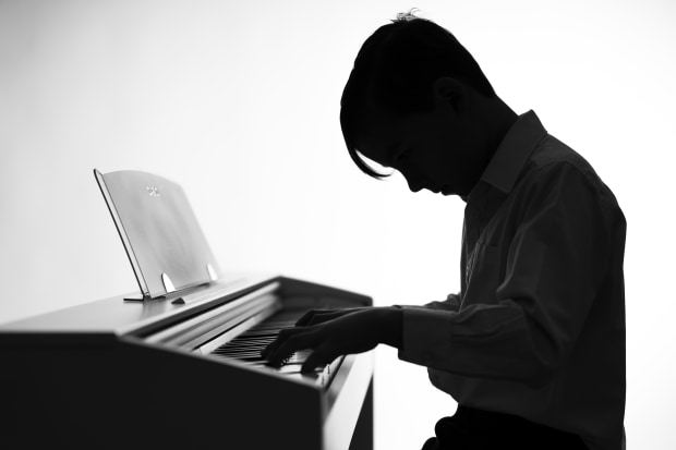 Young Oliver is dedicated to classical music. He loves his piano and at just 9 years old is starting to compose his own sonatas. I wanted to capture his artistic expression while also using light to play with his small frame through a silhouette. His trademark "hair flick" was a key feature as well as black and white to emphasize the classical nature of his music.