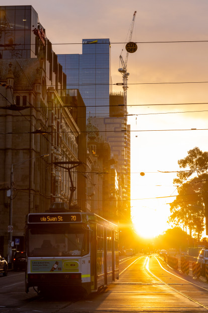 Bathed in sunrise, a tram rolls through the heart of Melbourne as light floods the street.
