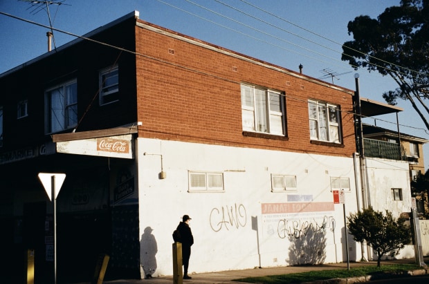 The last light of the day touches a suburban milk bar, its faded signage and red brick glowing against a pale sky. A figure lingers by the wall, their shadow cast long across the graffiti-marked facade. The scene feels both ordinary and cinematic, capturing a fleeting pause in the rhythm of everyday streets.