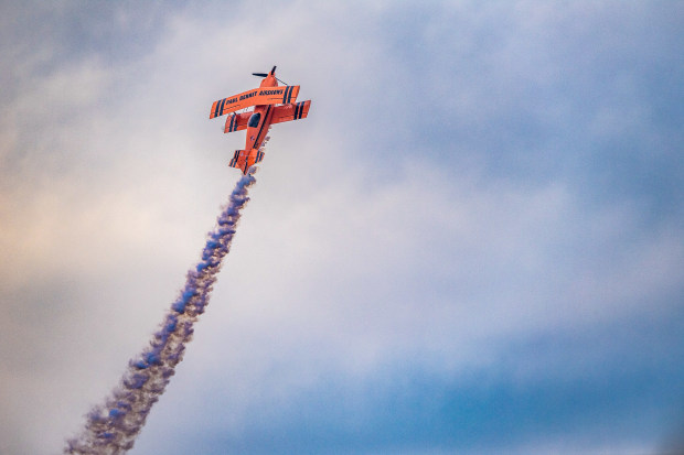 A Paul Bennet Airshows Pitts-type aerobatic biplane, flown by Glenn Collins, climbs vertically trailing smoke at Avalon, Victoria, captured seconds before the aircraft failed to recover from the loop and crashed.