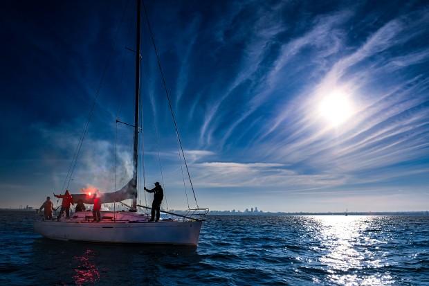 On Port Phillip Bay, an ocean racing yacht crew tests flares before a winter race, red light blossoms as smoke curls across the deck while the Melbourne skyline and cold sun sit on the horizon.