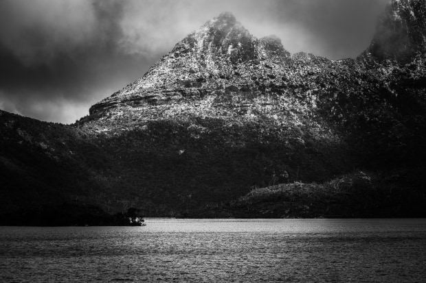Tasmania, Cradle Mountain at Dove lake, pinpointing a black and white take on the elements earth, water and air working harmoniously in the lightly snowy winter.