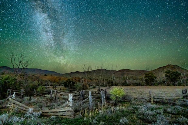 The weathered stockyards of Grindell’s Hut rest beneath a star-laden sky, where airglow and the Milky Way illuminate the timeless outback landscape.