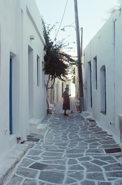 Film photograph taken in Paros, Greece (2023). Nona sweeping a laneway