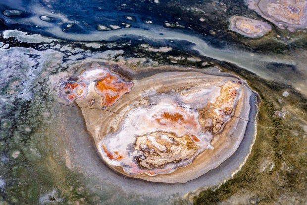 An aerial of a resistant patch of earth rebels against the floodwaters and algal blooms; like a gem or oyster shell amongst the slime. Burdekin Delta, QLD.