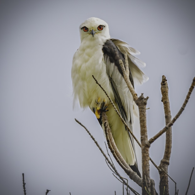 A Black Shouldered Kite feathers ruffled by the wind on a grey overcast day.