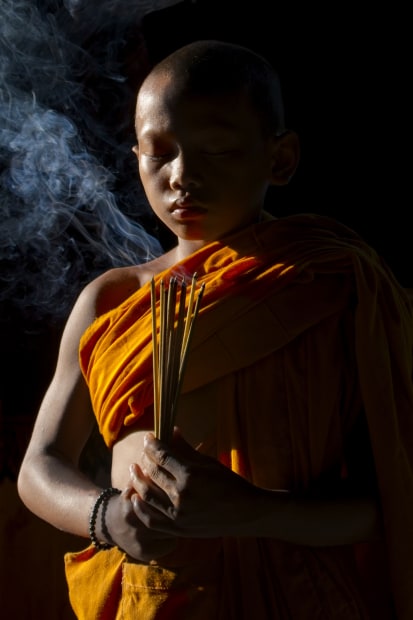 A Novice Cambodian Monk holding incense as the light fades in the doorway of an ancient temple.
