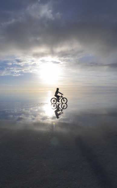 A lone cyclist glides across the mirrored expanse of Bolivia’s Salar de Uyuni, where the horizon disappears and the sky becomes the ground. In this fleeting moment, reflection and reality blur, capturing the stillness and surreal beauty of the world’s largest salt flat.