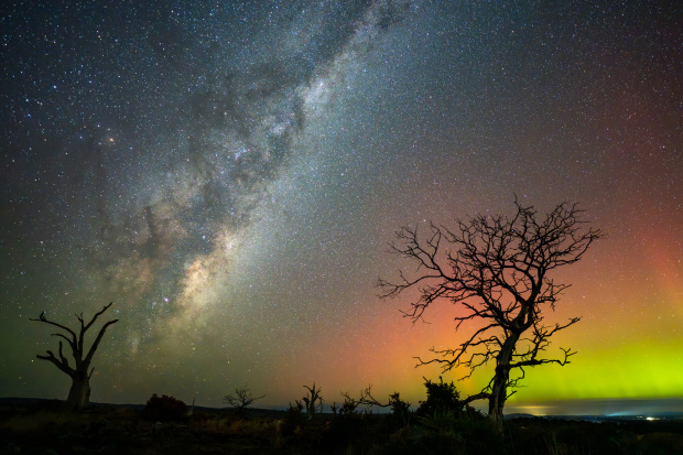 A single exposure of the Milky Way and Aurora Australis — a cosmic dance above timeless trees standing in quiet defiance.