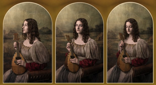 A young girl depicted as Saint Cecilia, the patron Saint of music, playing the lute. I wanted to create a triptych often used in Medieval times for representing religious figures in the church or as part of an altar. Her expression reflects divine inspiration, embodying purity and spiritual devotion.
