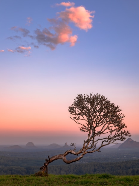 The wonderful narley tree bent by nature, standing strong overlooking the glasshouse mountains.