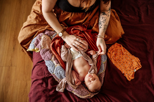 A mother changes her second daughter into an outfit from when her first was a newborn.