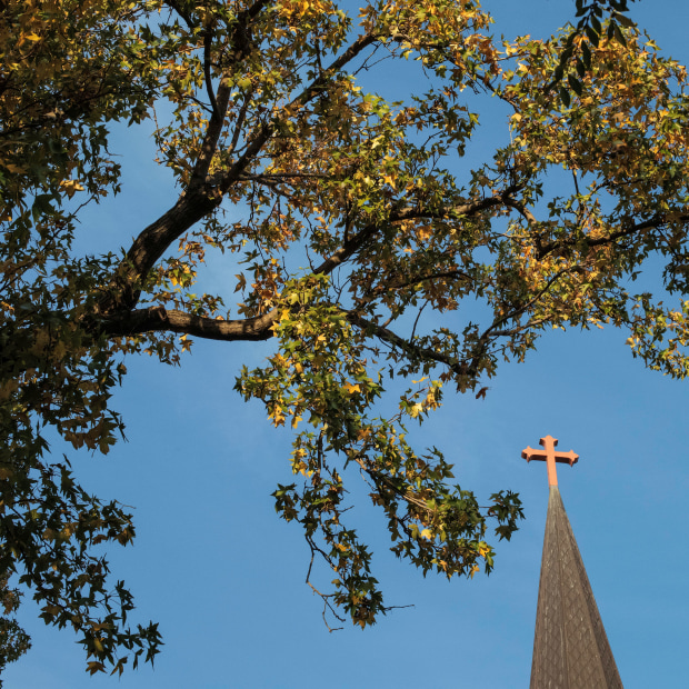 The steeple atop the bell tower of St Matthew's church can be seen through the autumn foliage in the church yard.