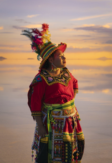 Captured on the Salar de Uyuni salt flats in Bolivia, this image portrays a woman adorned in vibrant traditional attire, standing still as the sky burns gold around her. I don’t know her name or the name of her community - but in this moment, framed by the silence of the salt and the fire of the sunset, she felt like the heartbeat of the land. This portrait is a quiet homage to presence, heritage, and the power of stillness.